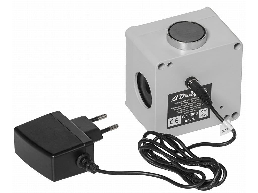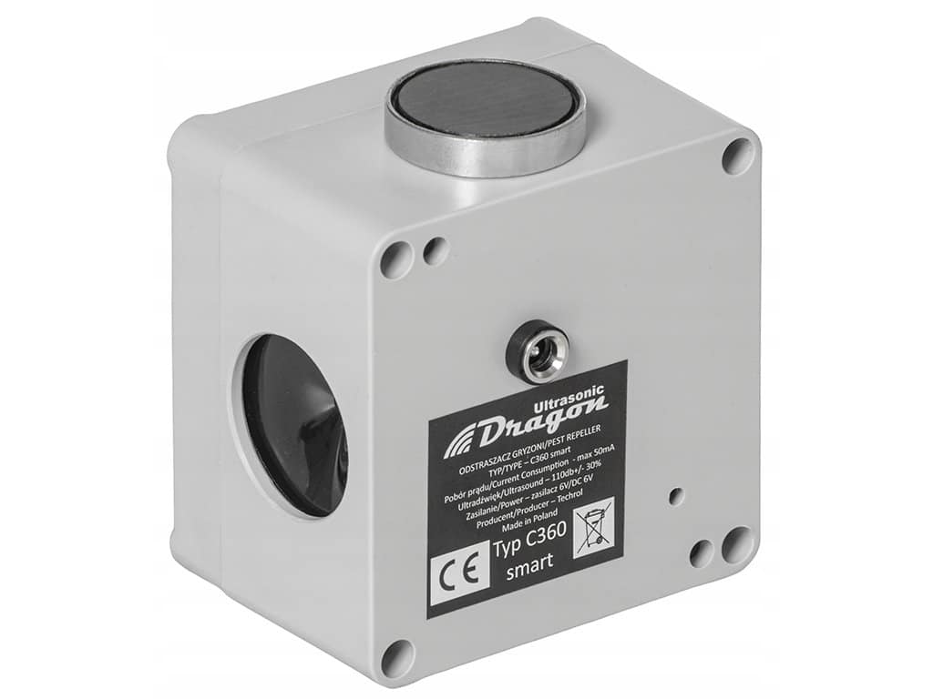 Plašič na kuny, myši a potkany DRAGON ULTRASONIC C360 SMART Ultrazvukový odpudzovač zveri vhodný na plašenie kún a hlodavcov, bezpečný pre človeka i domáce zvieratá. Na použitie vo vnútorných i vonkajších priestoroch, vybavený odolným vodotesným krytom s možnosťou uchytenia cez magnetický držiak. Odpudzovač kún s rozsahom tónu v uhle 270° s automatickou zmenou kmitočtu a dosahom až 1500 m2, s napájaním cez 6V adaptér. Plašič kún používa 3 x 40 mm membránové reproduktory, rozmery ultrazvukového odpudzovače 85x85x55mm. Ktoré škodcu plašič odpudzuje Tento plašič je vhodný na odpudzovanie kún, myší, krýs, potkanov a piskor.