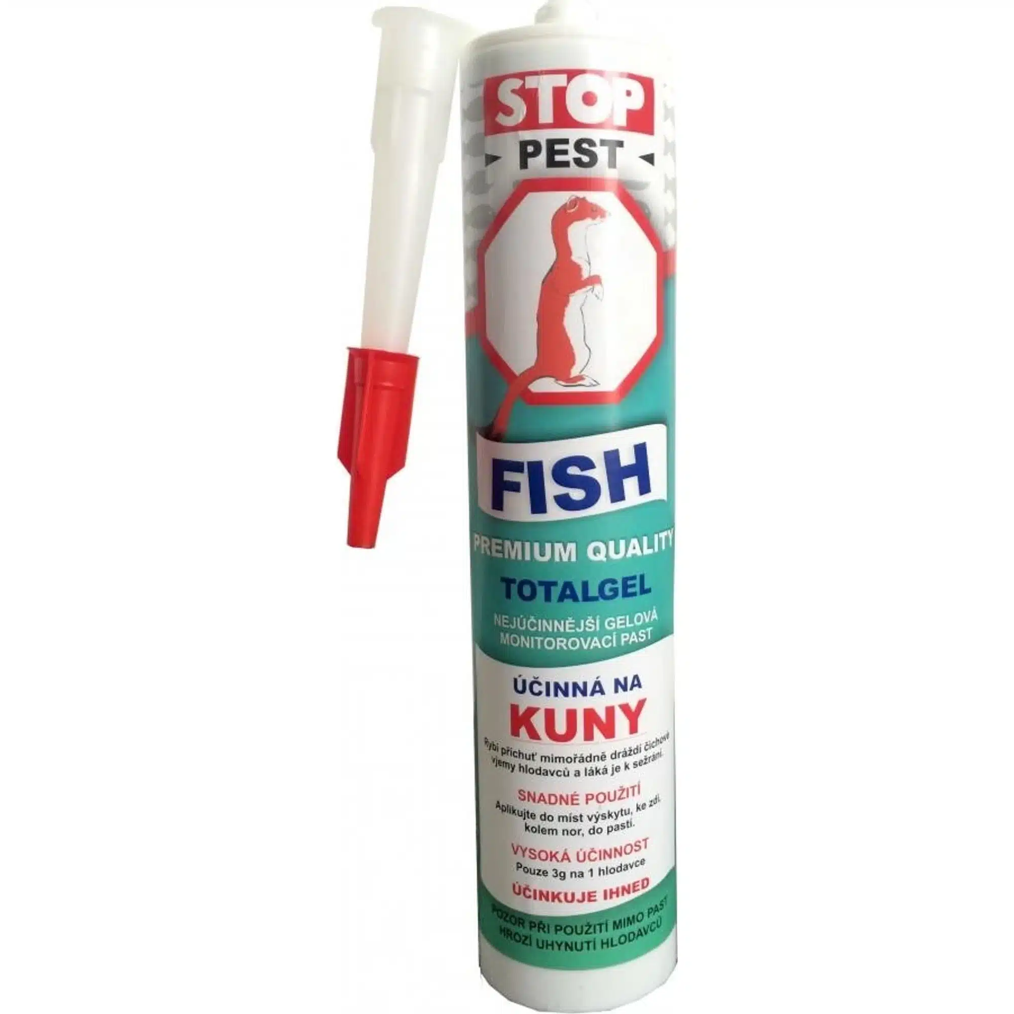 Kuny, Lasice, Hlodavce majú ku gélu voľný prístup, vďaka obsiahnutým zložkám je gél veľmi atraktívny, čim dochádza k predávkovaniu, rozbúšeniu srdca a následne k jeho zástave. Výhody výrobku FISH Total Gel KUNA 230g Účinný na kuny, potkany, myši, hlodavce Pasívna likvidácia gélom: GEL pôsobí tiež ako lepidlo, prilepí sa na labky, chvost, srsť, hlodavec sa olíže a gél vždy zožerie. Vysoká účinnosť: iba 3 – 5g na 1 hlodavca, účinkuje už do 2 dní od zožratia Prírodný produkt Pred aplikáciou je nutné aby gél mal izbovú teplotu 20 až 25 ° C. Pokiaľ bude teplota vyššia, napríklad v letných mesiacoch a pri ponechaní gélu na slnku, môže gél byť veľmi riedky až tekutý, čo Vám veľmi znepríjemní aplikáciu a hrozí že gél bude vytekať pri aplikácii samovoľne. Chladom gél veľmi tuhne a hrozí ťažké vytlačenie z tuby. Bude sa musieť gél veľmi stlačiť aby došlo k vytlačeniu. Zamedzte týmto ťažkostiam a uchovávajte gél v izbovej teplote. Jednoduché použitie :