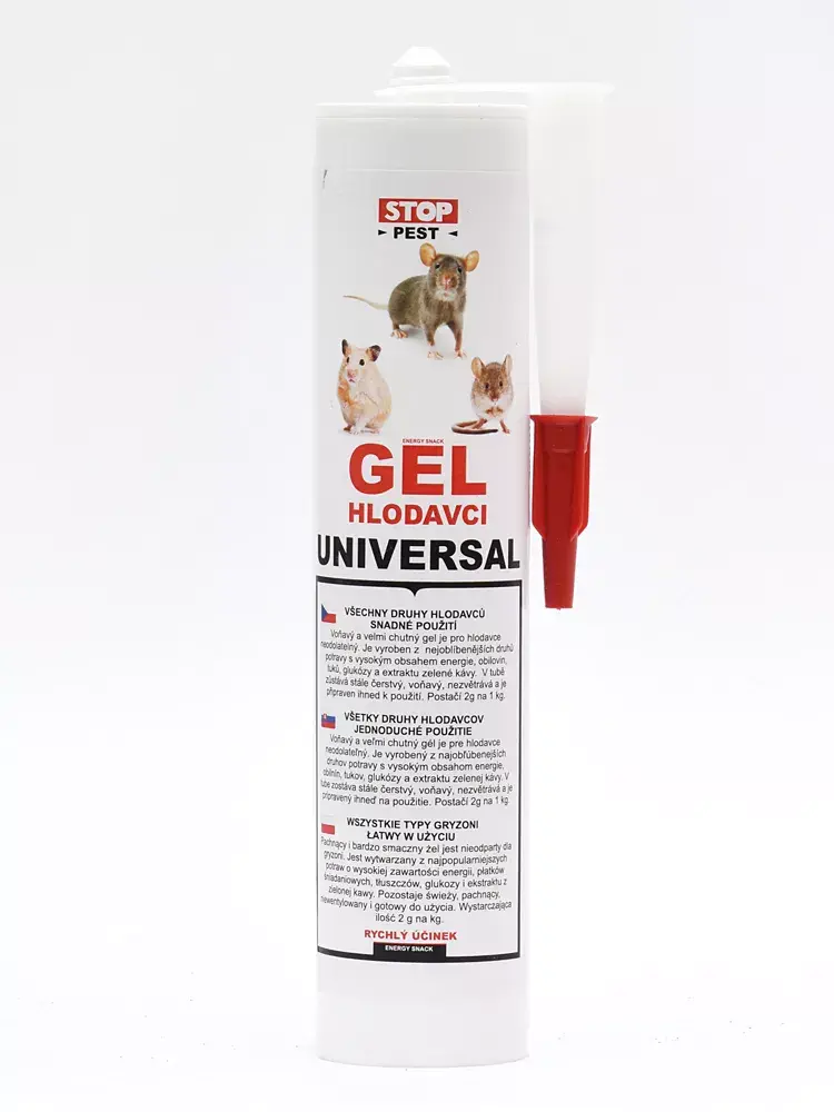 PRE HLODAVCE, KRTKO, POTKANY, HRABOŠ a MYŠI Náš tip: je vhodné aby gél mal izbovú teplotu 20 až 25 ° C. Pokiaľ bude teplota vyššia, dochádza k zvýšeniu atraktivity, predovšetkým sa zvýši aróma pre hlodavce. Súčasne však môže dochádzať k uvoľňovaniu tukov čo nemá žiadny vplyv na atraktivitu výrobku. Chladom gél tuhne ale nemení sa atraktivita. Balenie: PVC KARTUŠE 230g Pokyny pre skladovanie: Skladujte v suchu pri izbovej teplote. Chráňte pred priamym slnečným žiarením, max. 30 ° C, neskladujte v chlade a chladničke. Pozor pri skladovaní v nižšej teplote nedá dobre vytláčať! Vysoká účinnosť: iba 1g na 1kg váhy zvieraťa – pri prekročení môže spôsobiť smrť. PRÍRODNÝ PRODUKT obsahuje iba prírodné látky