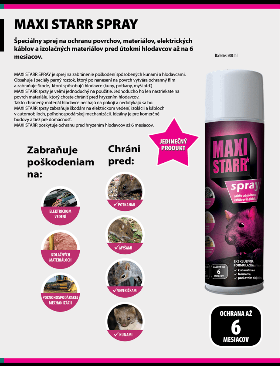 MAXI STARR SPRAY poskytuje spoľahlivú ochranu pre vaše káble a elektrické inštalácie, čím predchádza drahým opravám a udržuje vaše zariadenia v bezpečí pred hlodavcami.