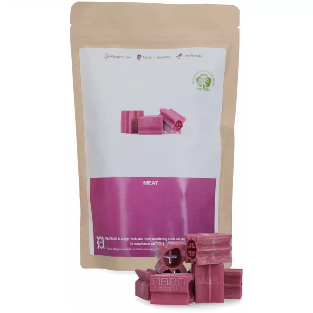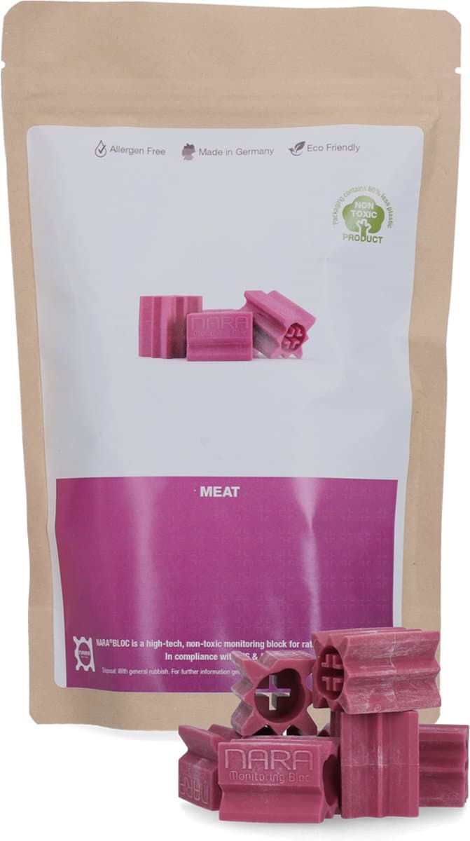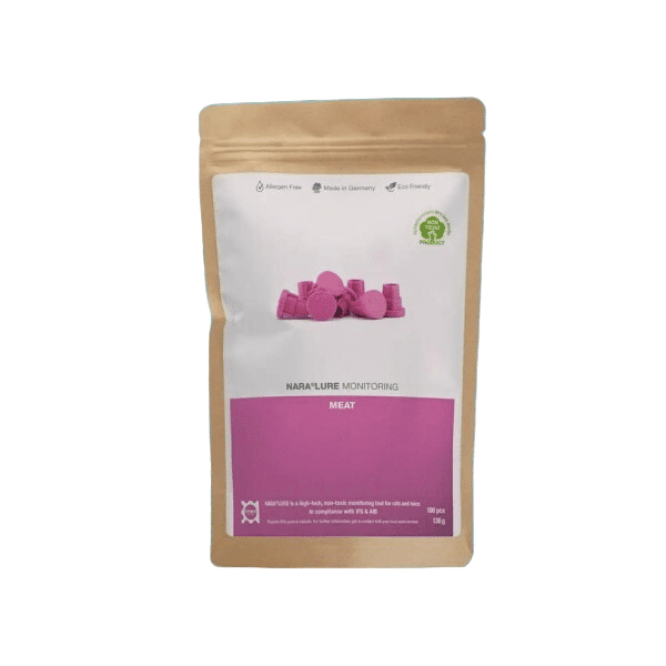 Návnada pre myši a potkany NARA LURE Mäso – 20 ks | Netoxická a účinná až 12 mesiacov je moderné riešenie pre bezpečnú a efektívnu kontrolu škodcov. Táto netoxická návnada, vyrobená zo špeciálneho ochuteného plastu, ponúka dlhodobú účinnosť a vysokú odolnosť voči vonkajším podmienkam. Aróma návnady vydrží minimálne 3 mesiace a v optimálnych podmienkach až 12 mesiacov, čo znamená menej častej výmeny a spoľahlivú ochranu. NARA LURE Mäso je bez alergénov, a preto je vhodná na použitie v citlivých prostrediach, ako sú potravinárske prevádzky alebo sklady. Vďaka svojej odolnosti voči vlhkosti a plesniam ju môžete používať aj v náročných podmienkach, ako sú vlhké priestory alebo extrémne teploty od -20 °C do +60 °C.