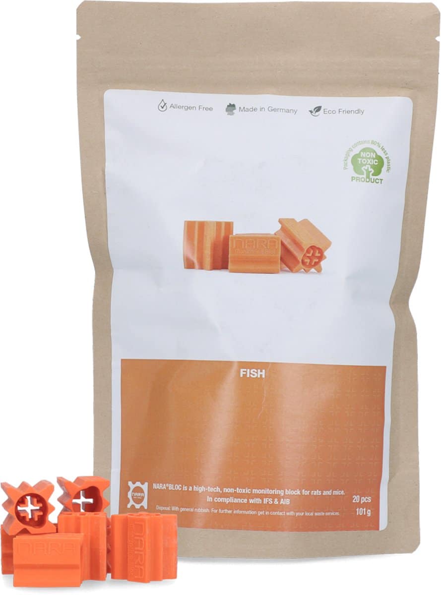 Návnada pre myši a potkany NARA LURE Ryba je moderné a ekologické riešenie pre efektívnu ochranu pred hlodavcami. Táto netoxická návnada je vyrobená zo špeciálneho ochuteného plastu, ktorý láka myši a potkany bez použitia alergénov alebo toxických látok. NARA LURE Ryba vyniká svojou odolnosťou voči vlhkosti a plesniam, čo ju robí ideálnou na použitie v náročných podmienkach. Vďaka plastovému materiálu nepriťahuje hmyz ani iné necielené druhy škodcov, čo zvyšuje jej účinnosť. Návnada je vhodná pre použitie v potravinárskom priemysle, lekárňach či iných citlivých prostrediach, kde je dôležitá hygienická bezpečnosť.