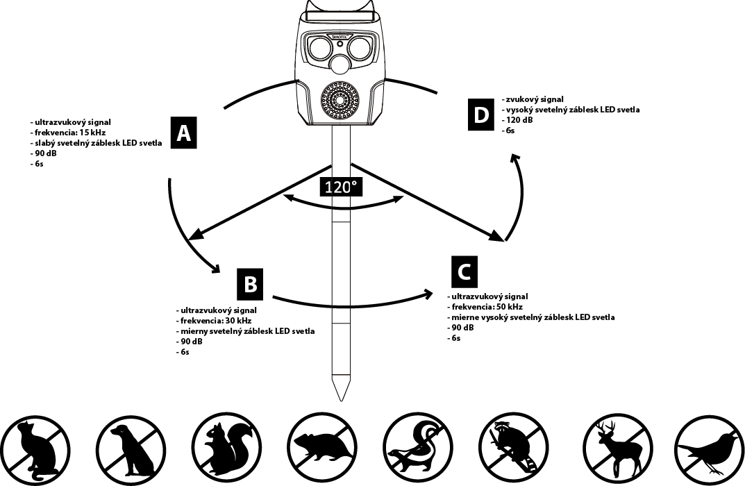 Solárny ultrazvukový odpudzovač nainštalujte na miesto, kde bude nabíjané slnečným žiarením. Ak v mieste inštalácie nie je priame slnečné žiarenie, skontrolujte batérie. – Zariadenie nemontujte do vody! Montáž do zeme – Zmontujte dokopy jednotlivé časti zapichovacej tyče. – Zapichovaciu tyč primontujte k odpudzovaču. – Odpudzovač zapichnite do zeme. Minimálna vzdialenosť od zeme je 23 cm. – Predtým ako zariadenie zapnete ho nechajte aspoň na 12 h nabíjať na slnku alebo vložte nové nabíjateľne batérie. – Prepnite vypínač do polohy ON a zariadenie zapnite. – Zariadenie nezapínajte skôr ako je úplne zmontované. Montáž na stenu – Odpudzovač je možné pripevniť na stenu bez použitia zapichovacej tyče. PREVÁDZKA – Ak sa zariadenie dlhší čas nepoužívalo pred použitím ho nechajte úplne nabiť na slnku alebo ho nabite pomocou USB. – Ak zariadenie ani po úplnom nabití nefunguje, vymeňte batérie. – Nikdy nezakrývajte senzor pohybu. – Ak sa v detekčnej oblasti nenachádza žiadne zviera, bude zariadenie v pohotovostnom režime. – Po detekovaní zveri pomocou senzora zariadenie začne automaticky vysielať štyri rôzne ultrazvukové signály až do momentu pokiaľ zver neopustí detekčnú oblasť. – Po 6 sekundách od opustenia detekčnej oblasti zvieraťom sa zariadenie automaticky prepne do pohotovostného režimu. Prevádzka -Nikdy nezakrývajte senzor pohybu. -Ak sa v detekcnej oblastinenachádza žiadne zviera, bude zariadeniev pohotovostnom režime. -Po detekovaní zveripomocou senzora zariadenie zacne automatickyvysielat štyri rôzne ultrazvukovésignály až do momentu pokial zverneopustí detekcnú oblast. NAPÁJANIE Solárny panel alebo USB SOLÁRNY PANEL NAPÄTIE 5,5 V MATERIÁL Polykryštalický kremík ROZMERY 8 x 4,5 cm NAPÄTIE 3,7 V PRÚD 45 mAh BATÉRIE 3 x 1,2 V AA 600 mAh, NI-NH TRIEDA OCHRANY IP67 SENZOR POHYBU TYP PIR DETEKČNÁ VZDIALENOSŤ 12 m DETEKČNÝ UHOL 120° FREKVENČNÝ ROZSAH 15-50 kHz ROZMERY (D x Š x V) 12 x 9,8 x 9,4 cm
