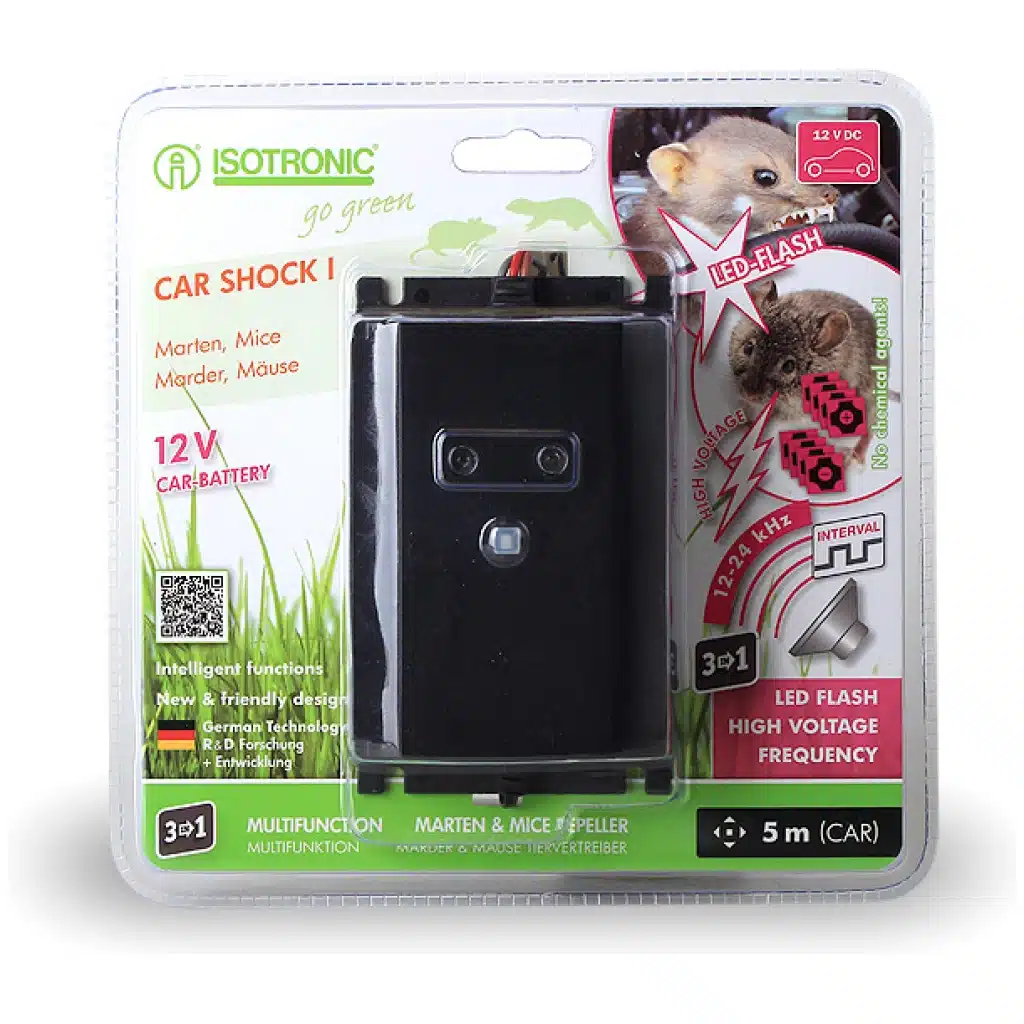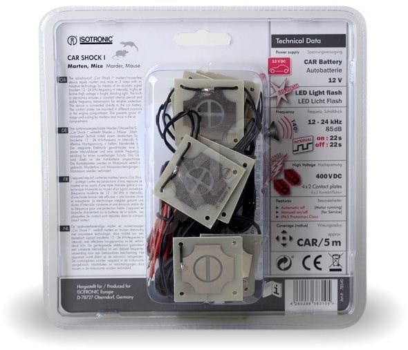 Vysokofrekvenčný odpudzovač kún a hlodavcov, navyše doplnený o 8 vysokonapäťových plôch pre maximálny a okamžitý účinok. Kvalitný nemecký produkt určený pre použitie v automobiloch, poľnohospodárskych strojoch, traktoroch, zapojenie cez zapaľovanie vozidla. Zariadenie vysiela akustický signál s frekvenciou 12 až 24 kHz v intervaloch 22 sekúnd a je doplnené o 8 vysokonapäťových plôch, ktoré sú kondenzátorom nabité na 400 voltov. Tieto vysokonapäťové platničky sa inštalujú pod kapotu do motorového priestoru na miesta pri vodné, vzduchové hadice, štartovacie káble a podobne. Pri dotyku s platničkou dostane zviera elektrický šok, ktorý ho okamžite odplaší. Vysokonapäťová platnička sa automaticku znovu nabije. Technické parametre: