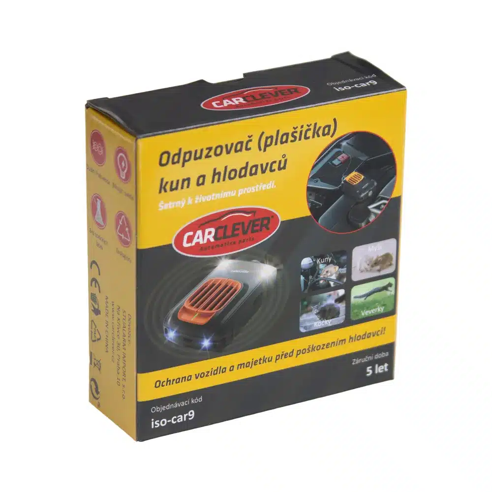 CARCLEVER CAR ISO-CAR9 je kompaktný ultrazvukový plašič, ktorý chráni auto a garáž pred kunami, hlodavcami (myši, potkany) aj mačkami. Tieto zvieratá dokážu narobiť značné škody ohlodávaním káblov, plastov alebo izolácií v motorovom priestore. Tento odpudzovač im uškodiť nemôže – iba ich odradí od pobytu tam, kde nemajú čo hľadať.