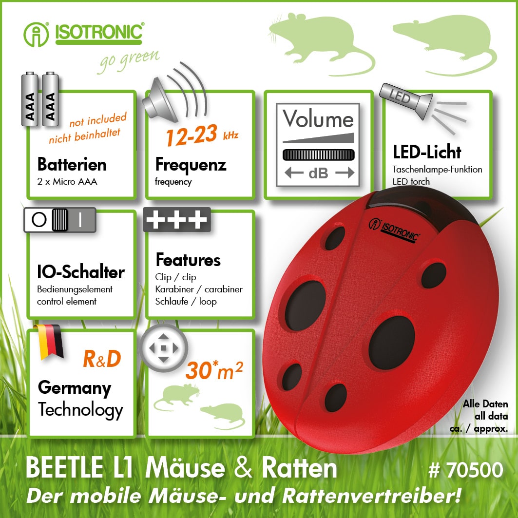 Nová elektronika znamená minimálnu spotrebu energie. Zariadenie vydáva v intervaloch vysokofrekvenčné zvuky a navyše svetelný signál. Majte na pamäti, že spotrebič sa pravdepodobne spustí v režime móde pauzy a potom sa prepne do režimu signálu. Toto nie je žiadna technická porucha. Technické dáta : Napájanie z batérie: 2 x AAA Micro (nie je súčasťou balenia) Efektívny rozsah: približne. 30 m² vnútri  a vonku s polomerom 6 m Frekvencia: 12-23 kHz +/- 10% Ovládanie hlasitosti: nekonečné nastavenie Svetlo: LED ZAP./VYP Výmena batérií  :