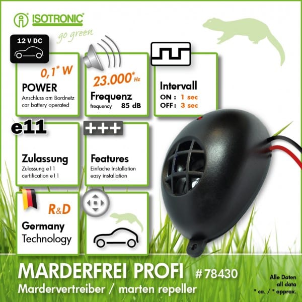 ISOTRONIC 78407: Koniec rozhryzených káblov v motore Návšteva kuny v motore auta často končí drahou opravou elektroinštalácie. Profesionálny plašič ISOTRONIC ponúka modernú cestu, ako predísť týmto nepríjemnostiam. Prístroj vysiela ultrazvukové vlny v 3-sekundových intervaloch, čím vytvára nepriateľské prostredie pre všetkých hlodavcov. Práve vďaka automatizovanej práci zariadenie neustále stráži vaše vozidlo, aj keď práve neparkujete v garáži.