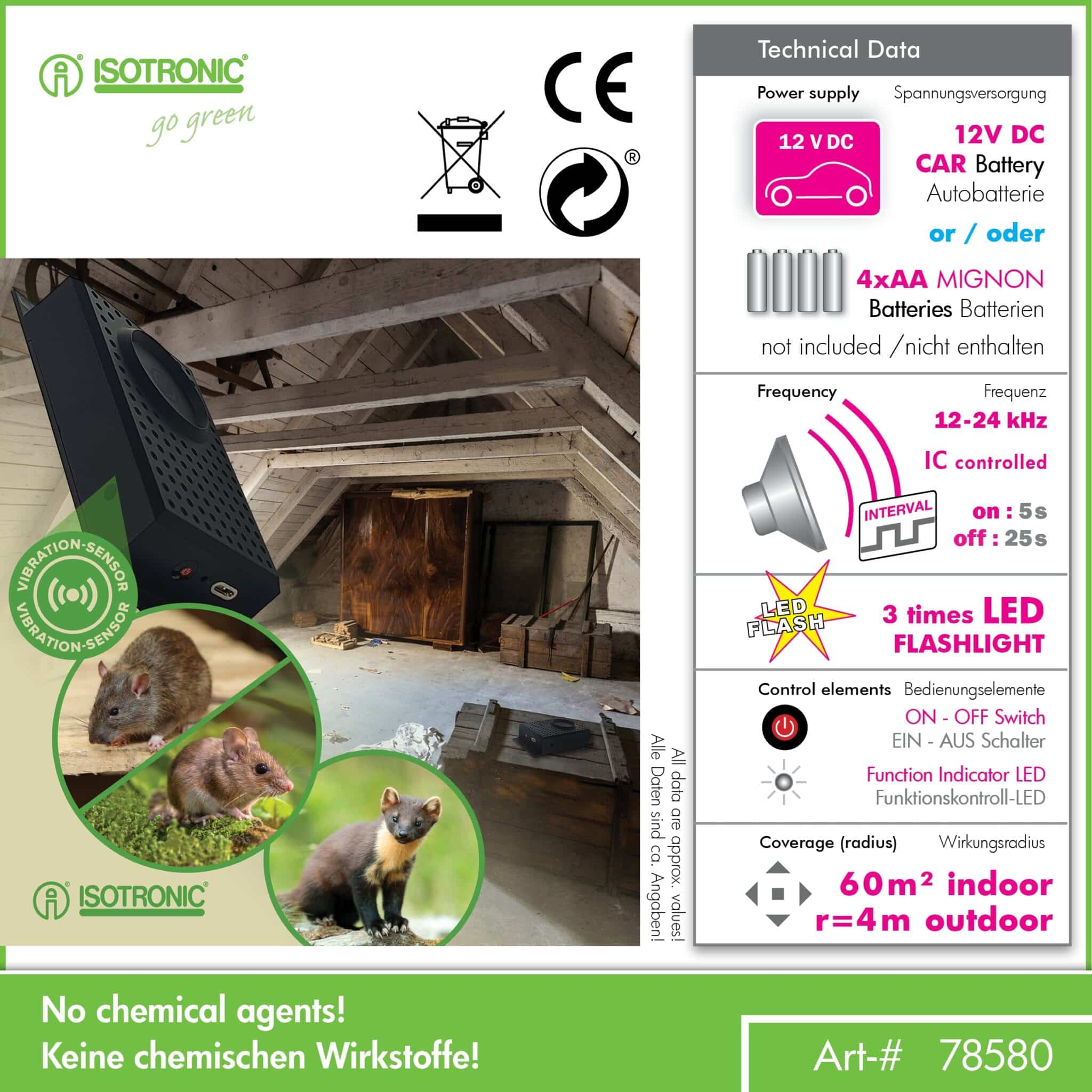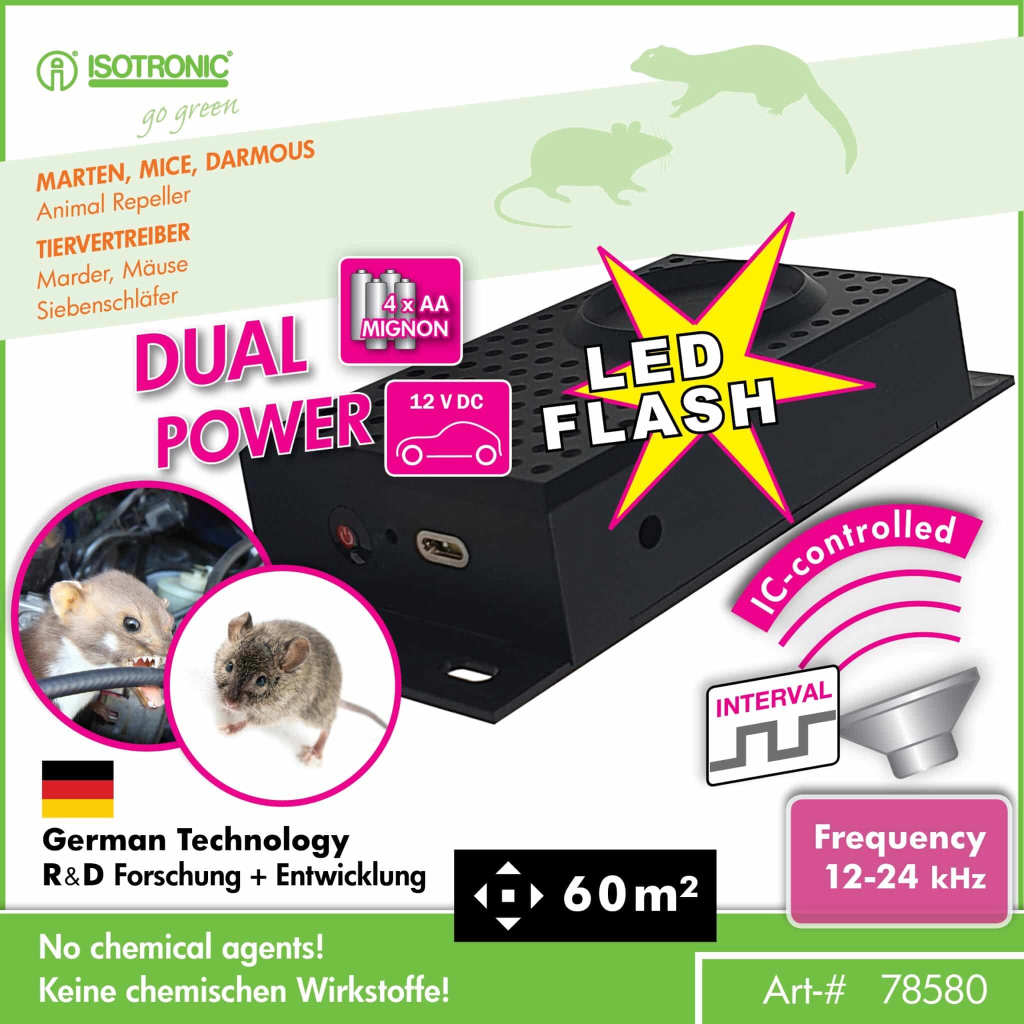 ISOTRONIC 78580: Univerzálna ochrana auta aj domova Hľadáte riešenie, ktoré ochráni vaše auto pred prehryznutými káblami a zároveň udrží hlodavce mimo vašej povaly? ISOTRONIC 78580 je odpoveďou na oba problémy. Tento inteligentný prístroj využíva fakt, že kuny a hlodavce majú mimoriadne citlivý sluch. Agresívne vysokofrekvenčné tóny sú pre ne natoľko nepríjemné, že sa chránenému priestoru oblúkom vyhnú.