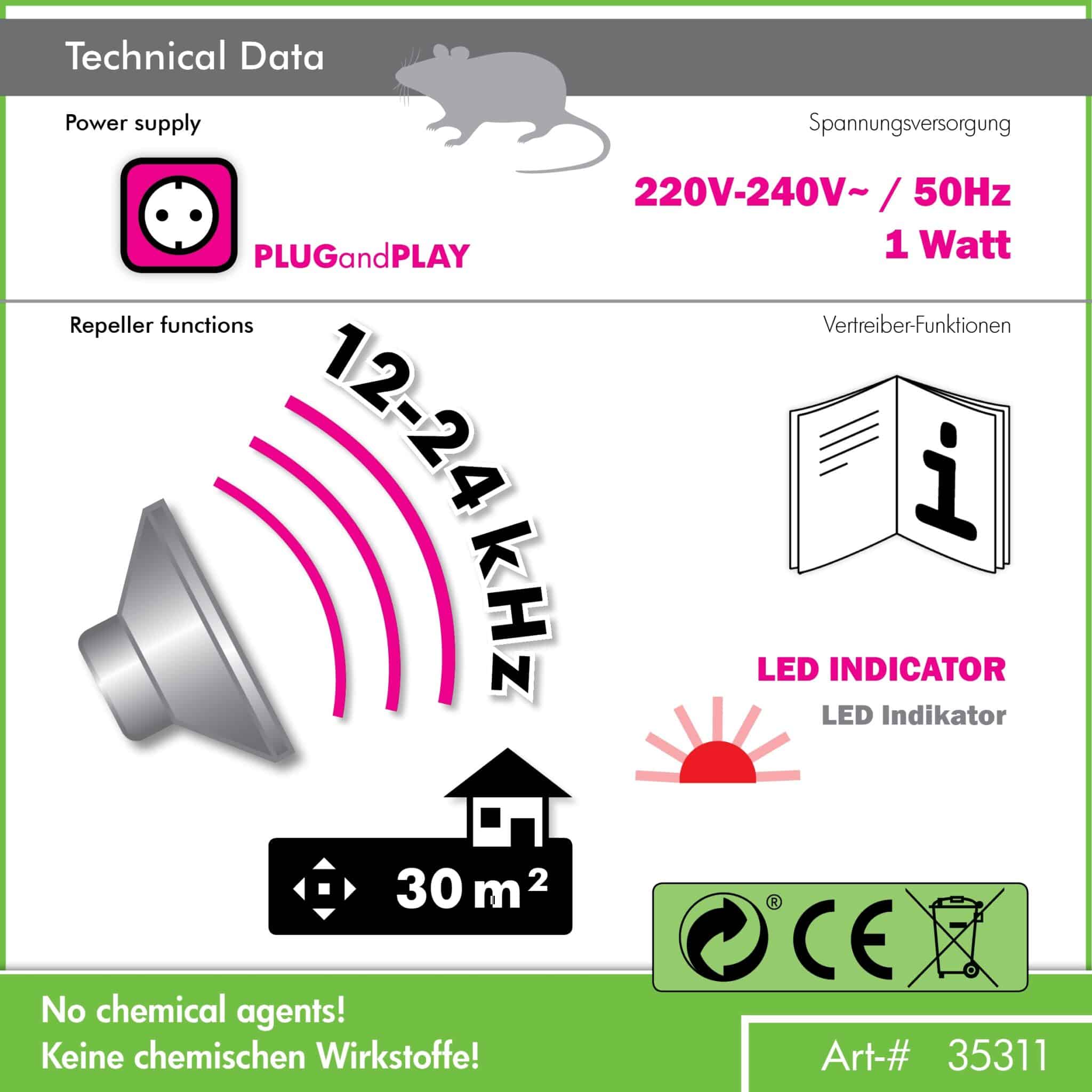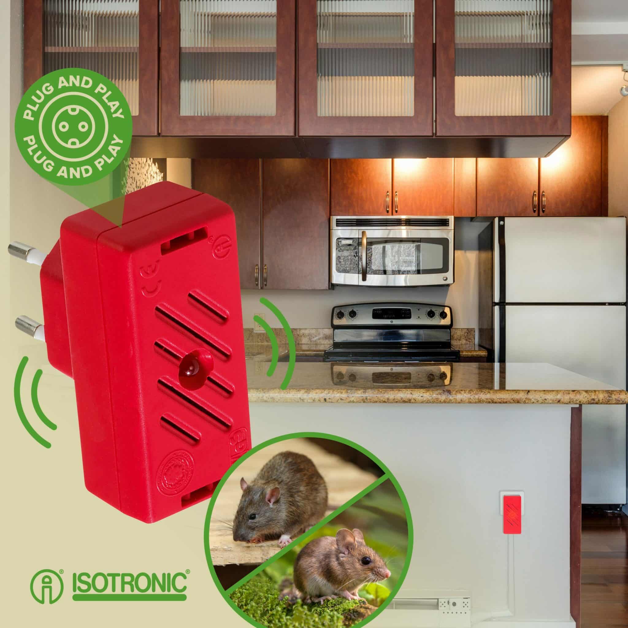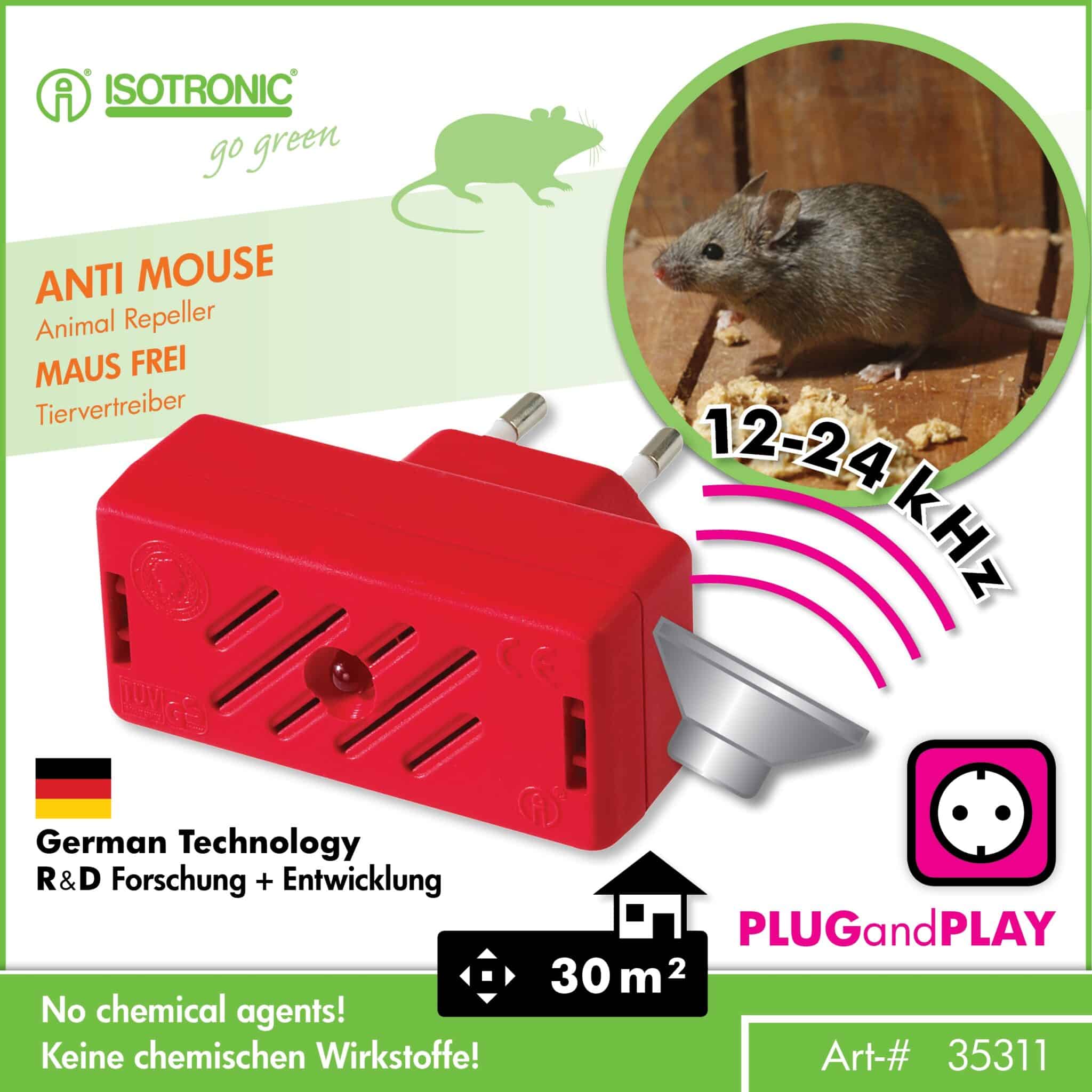 Myši sú odplašené od zariadenia prostredníctvom ultra-vysokých zvukvých frekvencií, nepočuteľných pre ľudské ucho. Plašič myší a hlodavcov ISOTRONIC 35311 je ultrazvukový prístroj určený na odpudzovanie myší a iných hlodavcov pomocou vysokofrekvenčného zvuku, ktorý je pre ľudské ucho nepočuteľný, ale pre škodcov veľmi nepríjemný. Tento odpudzovač je efektívny v interiérových priestoroch, ako sú garáže, pivnice, sklady či podkrovia.