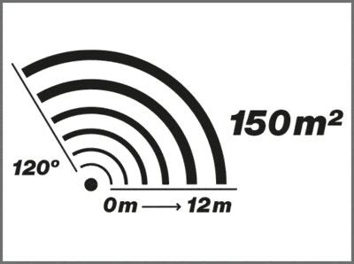 Približne 12 metrov v uhle 120°, čo pokrýva plochu až 150 m².