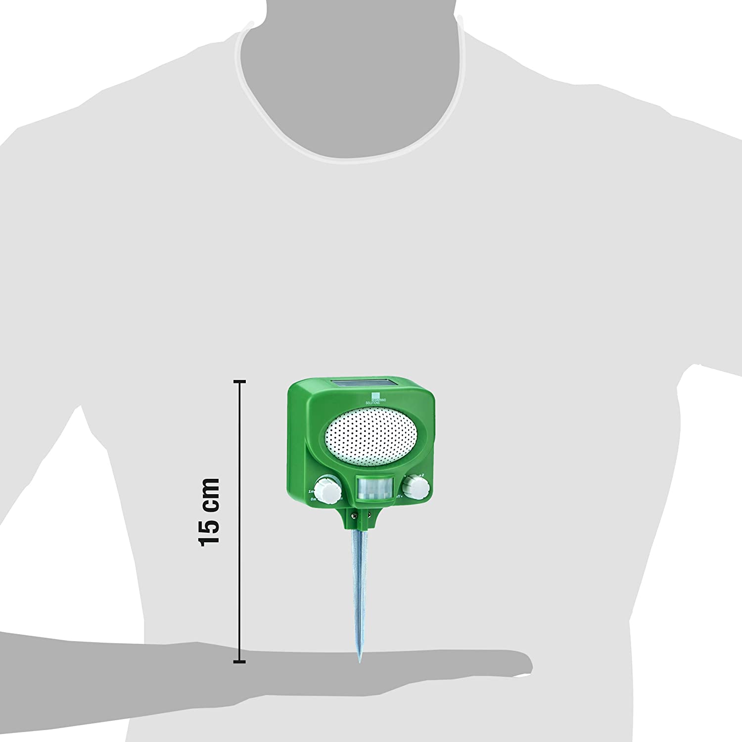 Svoj nový solárny ultrazvukový odpudzovač zvierat SWISSINNO uvediete do prevádzky v priebehu niekoľkých sekúnd. Prístroj stačí osadiť na priloženú hliníkovú tyč a pevne zapichnúť do pôdy. Ideálne miesto je priamo v smere, odkiaľ zvieratá najčastejšie vnikajú na váš pozemok. Na prednom paneli nájdete dva intuitívne ovládače: