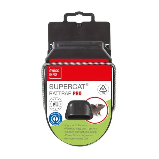 SWISSINNO® Rat Trap PRO SuperCat – profesionálna pasca na potkany s patentovaným spúšťacím mechanizmom a silnou údernou silou. Predáva sa bez návnady, ktorá sa dokupuje samostatne.