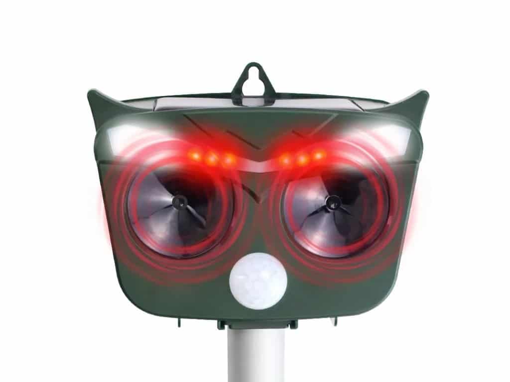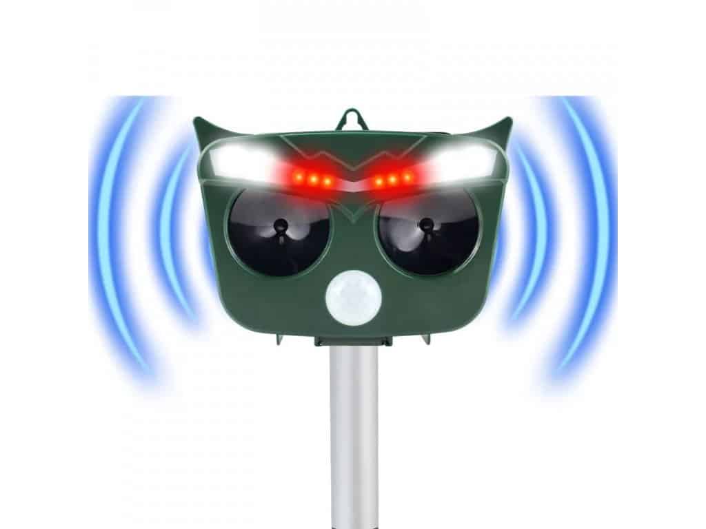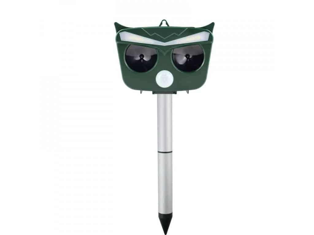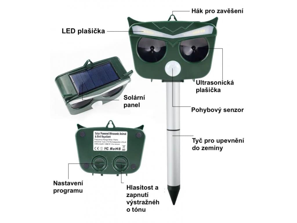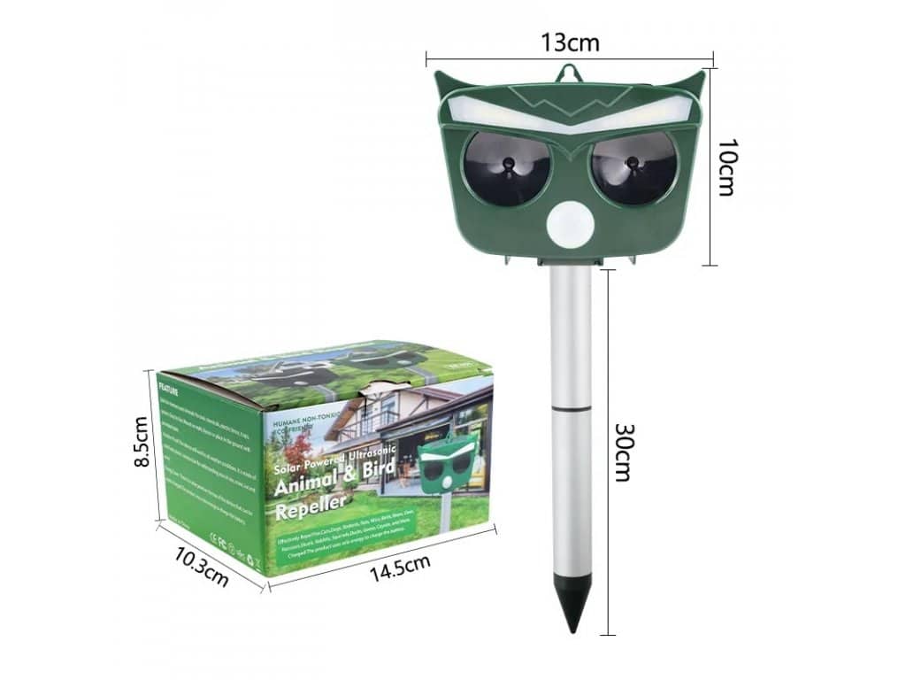 ANIMAL-X2 Ultrazvukový solárny odpudzovač plašič zveri a vtákov Odpudzovač zveri a vtákov s 2 ultrazvukovými reproduktormi, infračerveným snímačom pohybu, plachými LED diódami, solárnym panelom na bezdrôtovú prevádzku a integrovanou batériou. Štýlový a praktický dizajn sovy. Video návod na zloženie a základný popis zariadenia: Test Animal-X2 na terase: Hlavné funkcie zariadenia: