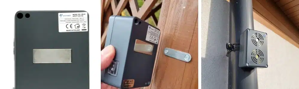 Odpudzovač VIANO pripevníte pomocou magnetického držiaka ľahko, rýchlo a bezpečne na takmer akýkoľvek povrch. Odpudzovač je vybavený silným neodymovým magnetom, používaným v priemyselnej upevňovacej technike. Stačí tak kúsok kovového povrchu, napr. potrubie, zábradlie, odkvap, kovový parapet, strešné konštrukcie, kúrenie atď. a ihneď máte bez akejkoľvek montáže prístroj nainštalovaný.