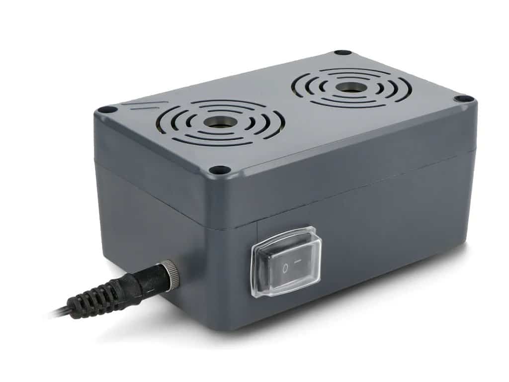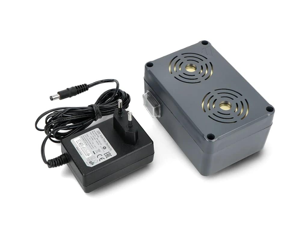 Zariadenie je napájané cez 12V adaptér, ktorý je súčasťou balenia. Odpudzovač disponuje praktickým vypínačom v ochrannom puzdre, vďaka ktorému ho môžete jednoducho vypnúť a zapnúť bez nutnosti vypojiť adaptér zo siete.